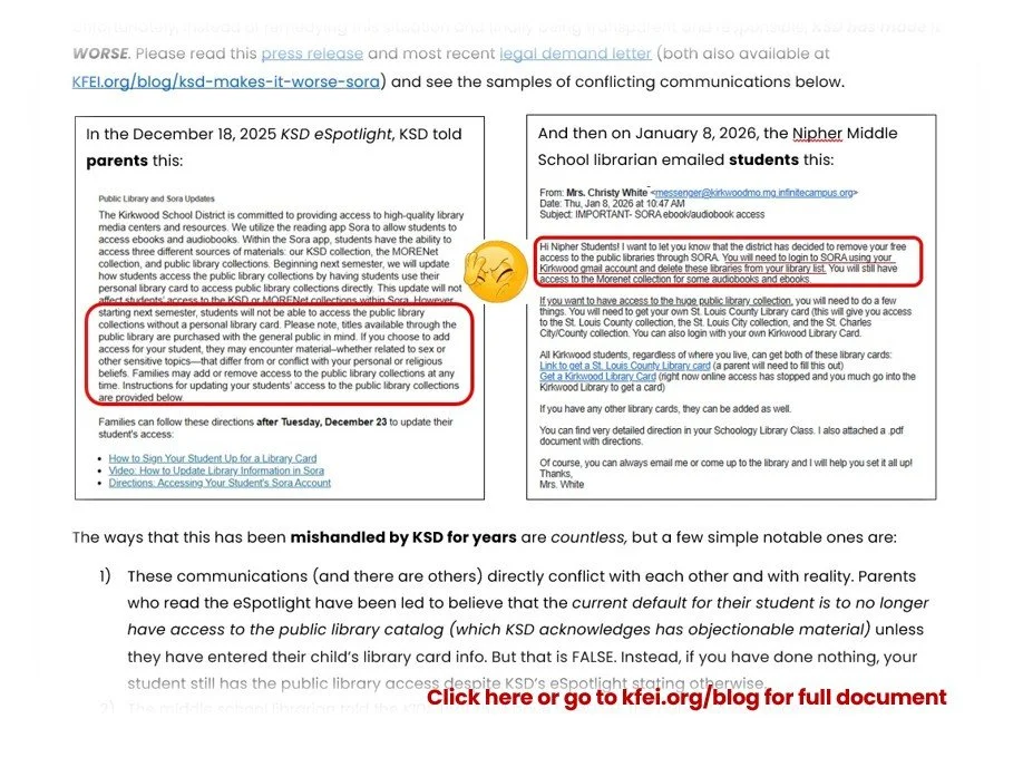 KSD’s recent communication to families about the Sora reading app (provided to all KSD students on their school devices) makes contradictory assertions, and the remedy they’ve suggested (albeit a weak one) has not been put in place despite assurance to parents that it would be by now. Rather than adequately and responsibly alerting parents about sexually explicit content, KSD has given them a false impression that it has been taken care of.