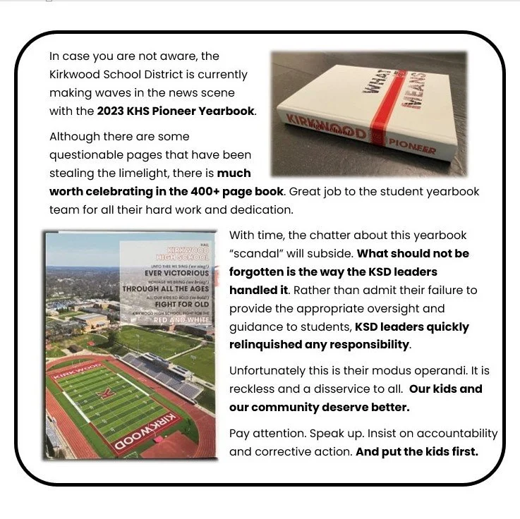 In case you are not aware, the 2023 KHS Yearbook is making waves in the news, but it is imperative that we not lose sight of the KSD leadership's role in this.